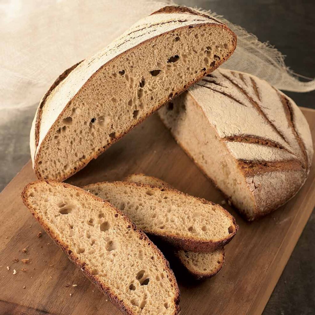 D’aspect brut, la tourte aux trois blés présente des arômes torréfiés et boisés, des notes acidulées et une bonne longueur en bouche. Des qualités qui la rendent parfaite aussi bien au petit-déjeuner, toastée avec un peu de beurre, que pour organiser de divins repas-tartines.
