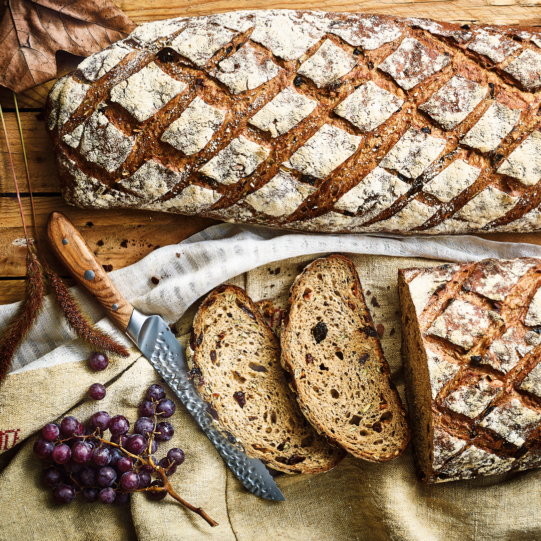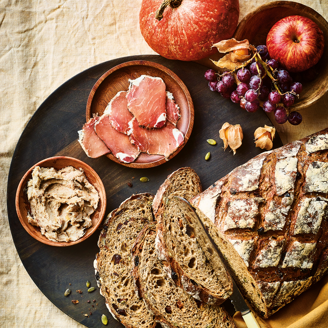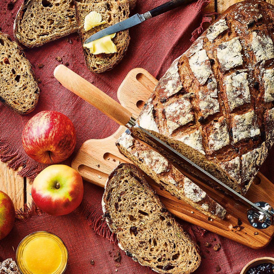 Lorsque le Solognot, pain rustique réalisé à partir de farines de blé et de seigle, et d’un mélange de graines, rencontre le Mélange Croq’Fruits composé de graines de courges, de raisins secs, de pruneaux de cubes de pommes, cela donne naissance à un pain original aux saveurs puissantes !